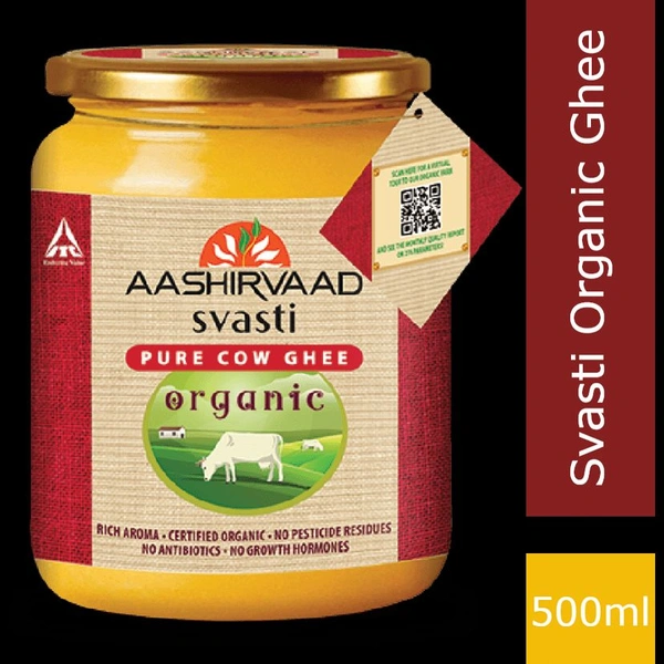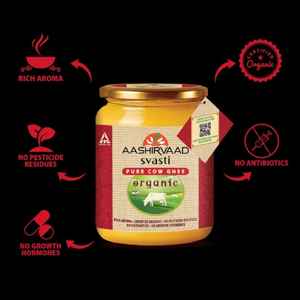 Aashirvaad Svasti presents the ‘Aashirvaad Svasti Organic Cow Ghee’ with our unique ‘AroMA of Love’. Aashirvaad Svasti Organic Pure Cow Ghee is made with 100% Organic Cow Milk sourced from 7000+ healthy cows.